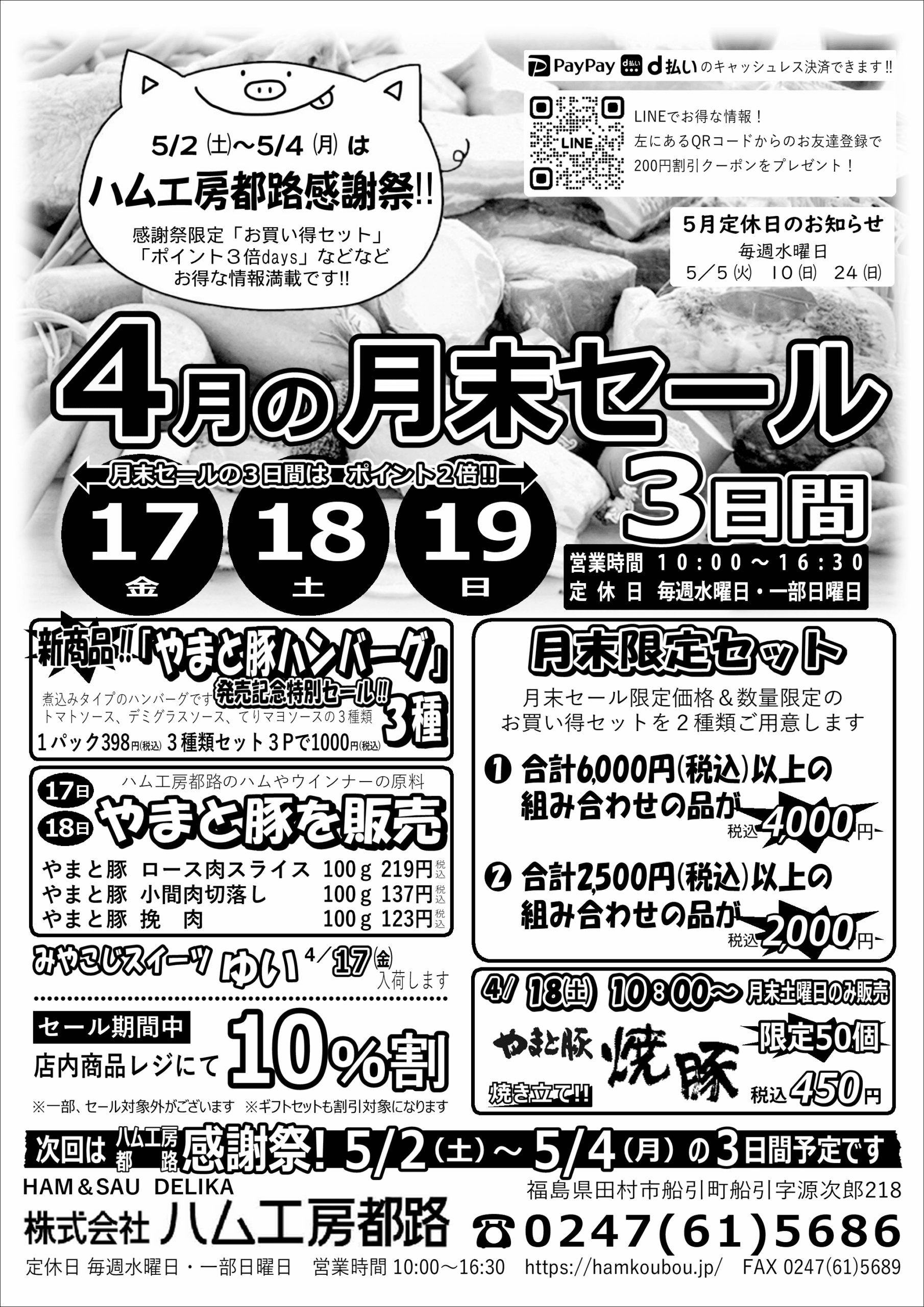 5月はゴールデンウィークに感謝祭を開催するため、4月の「月末セール」は日程を変更し、4/17(金)〜19(日)の3日間、田村市船引町の「直売所」で開催いたします。